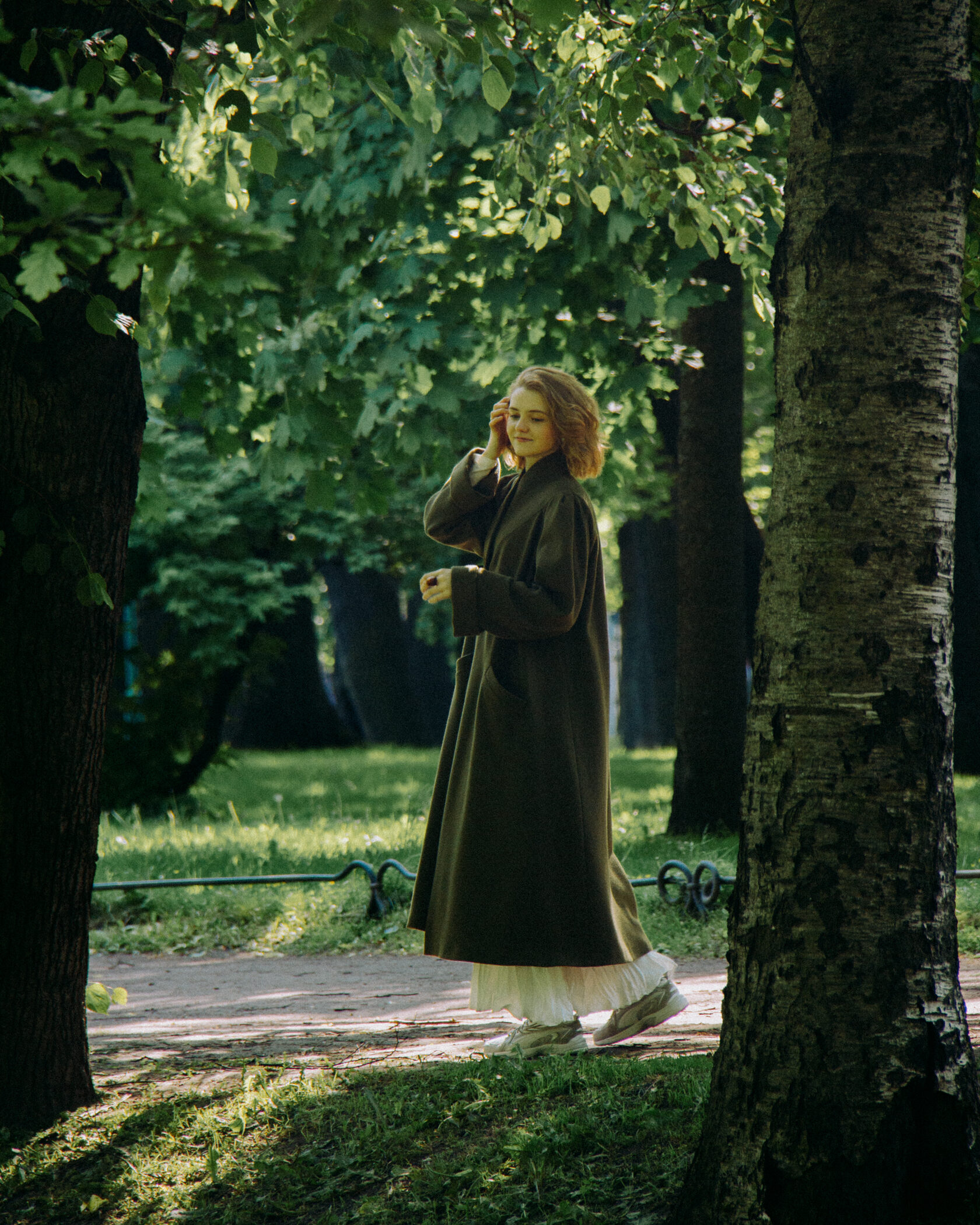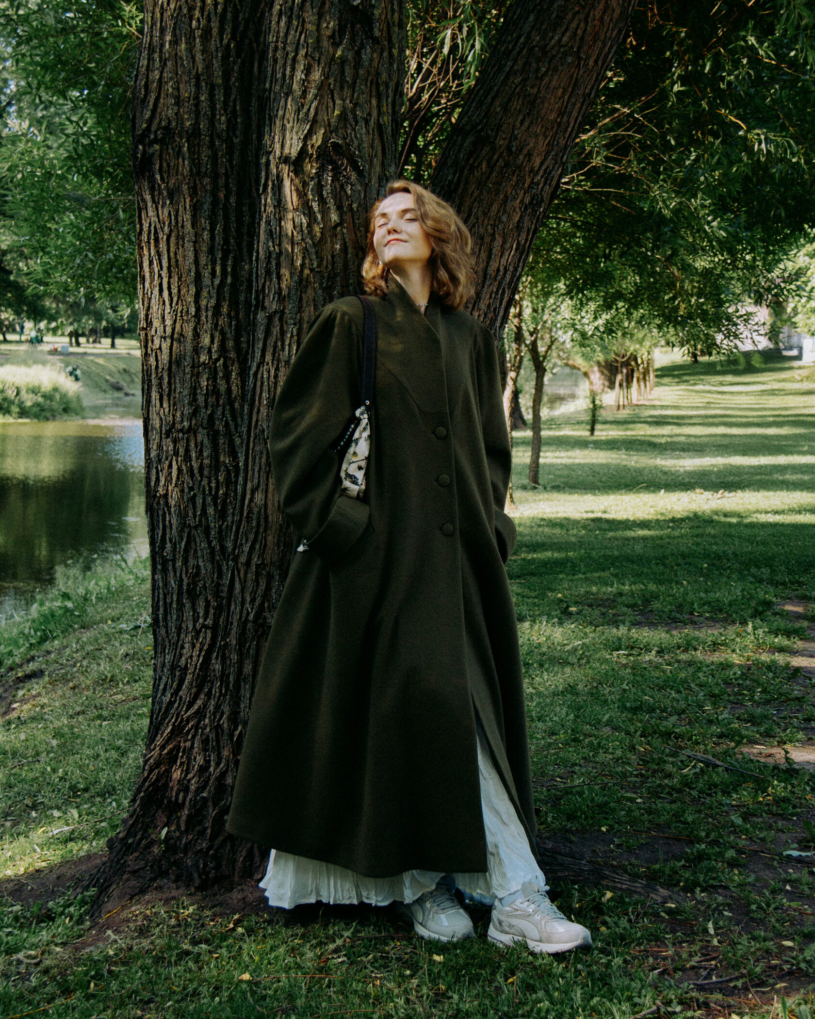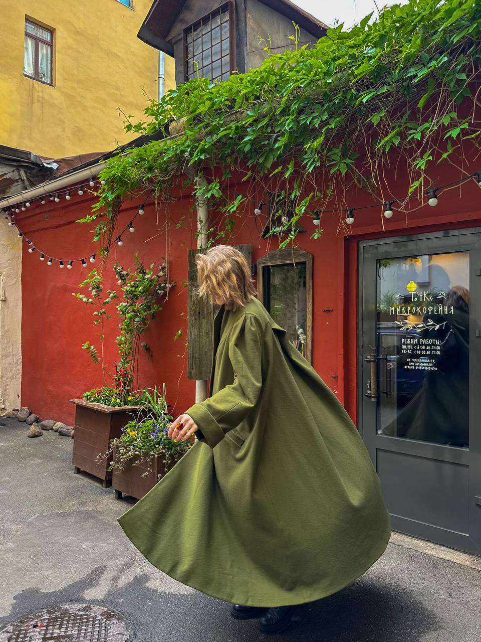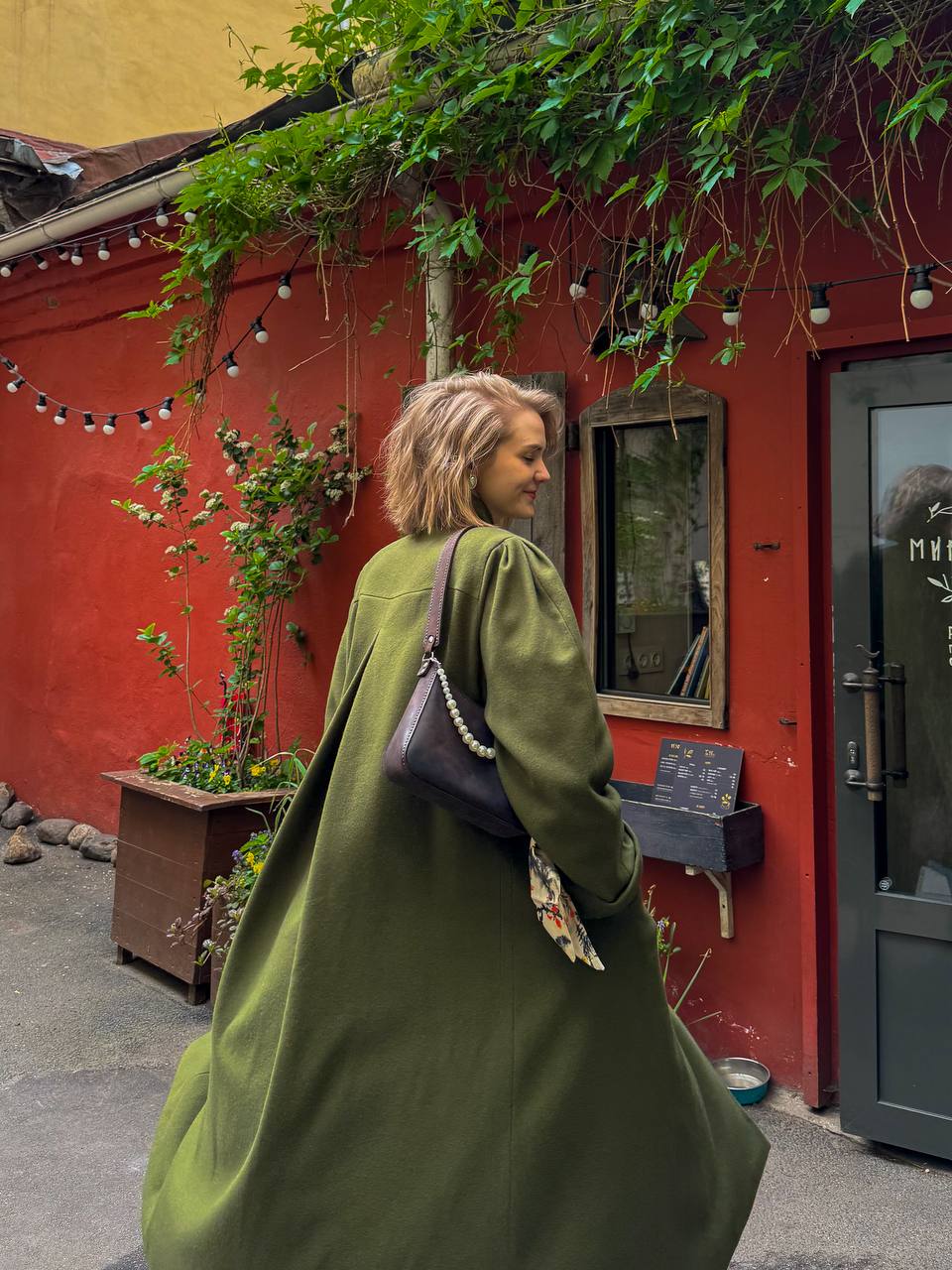 Детали Палто трапециевидного силуэта в оттенке хаки, с отрезной кокеткой по полочке и спинке, подплечники создают акцент в области плеч, на рукавах 2 встречные складки.