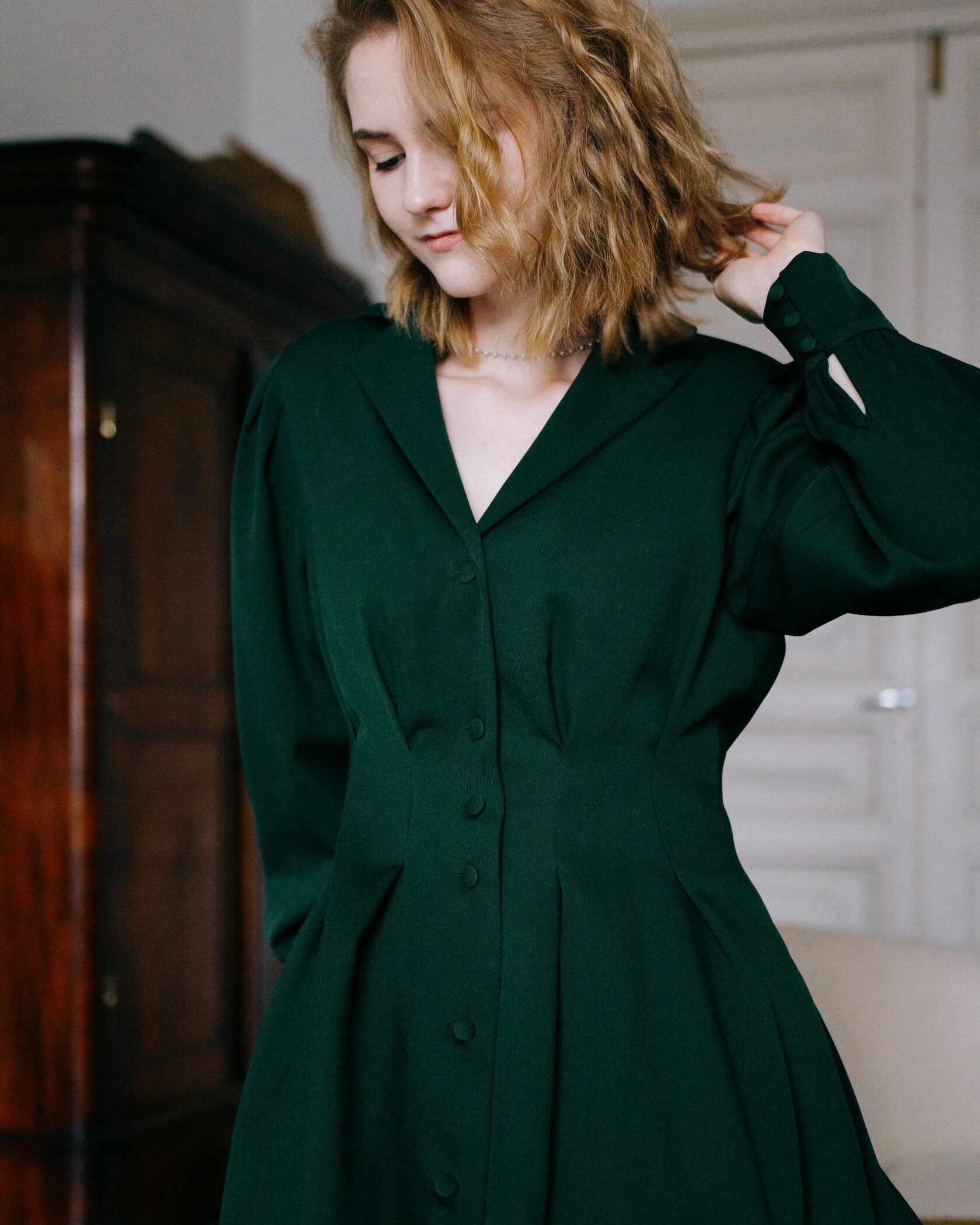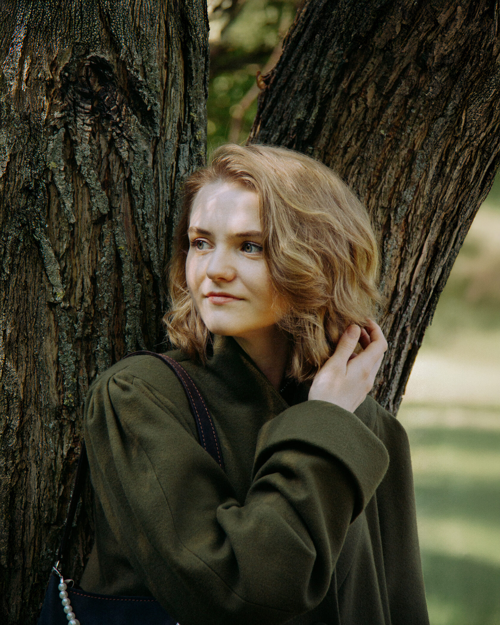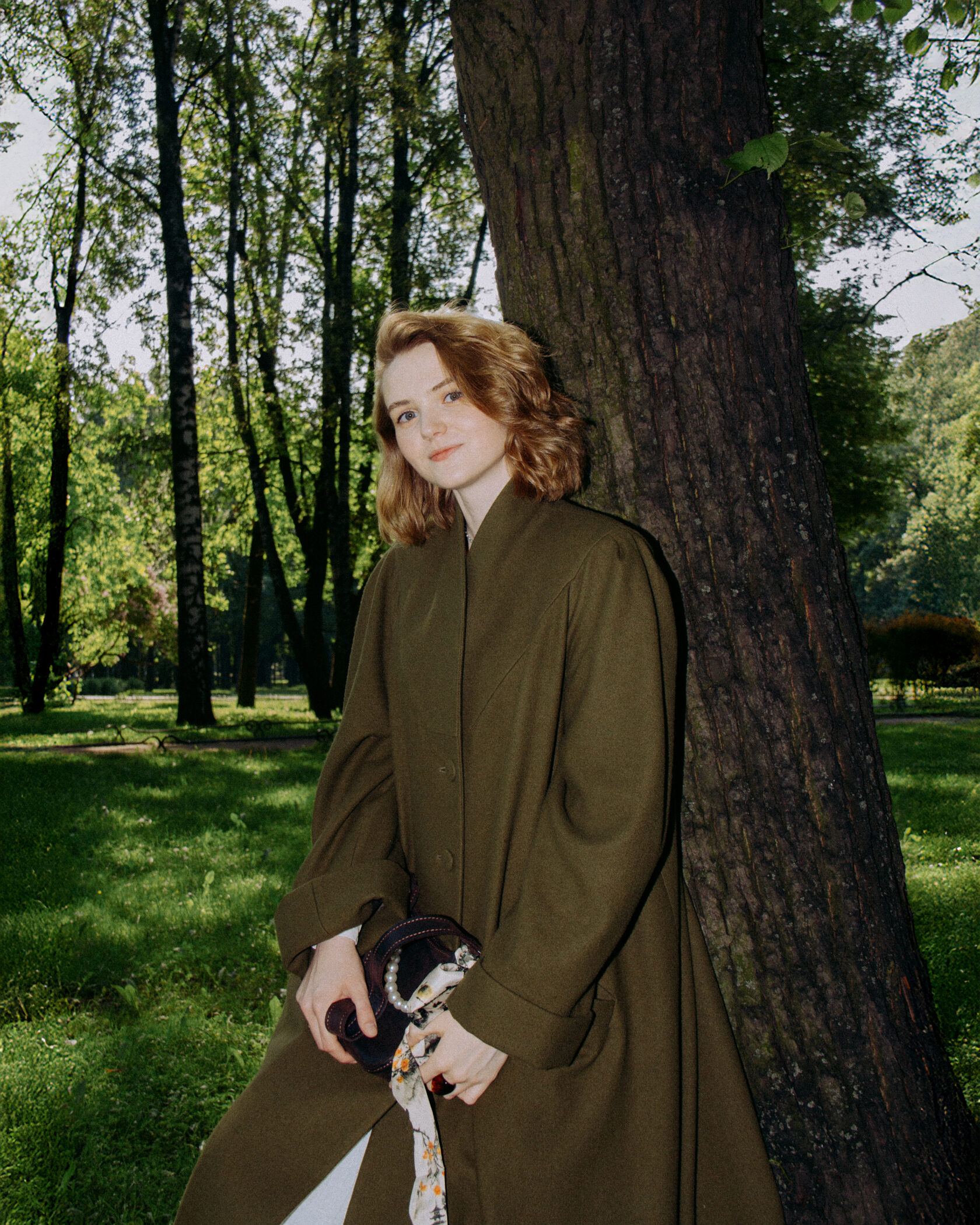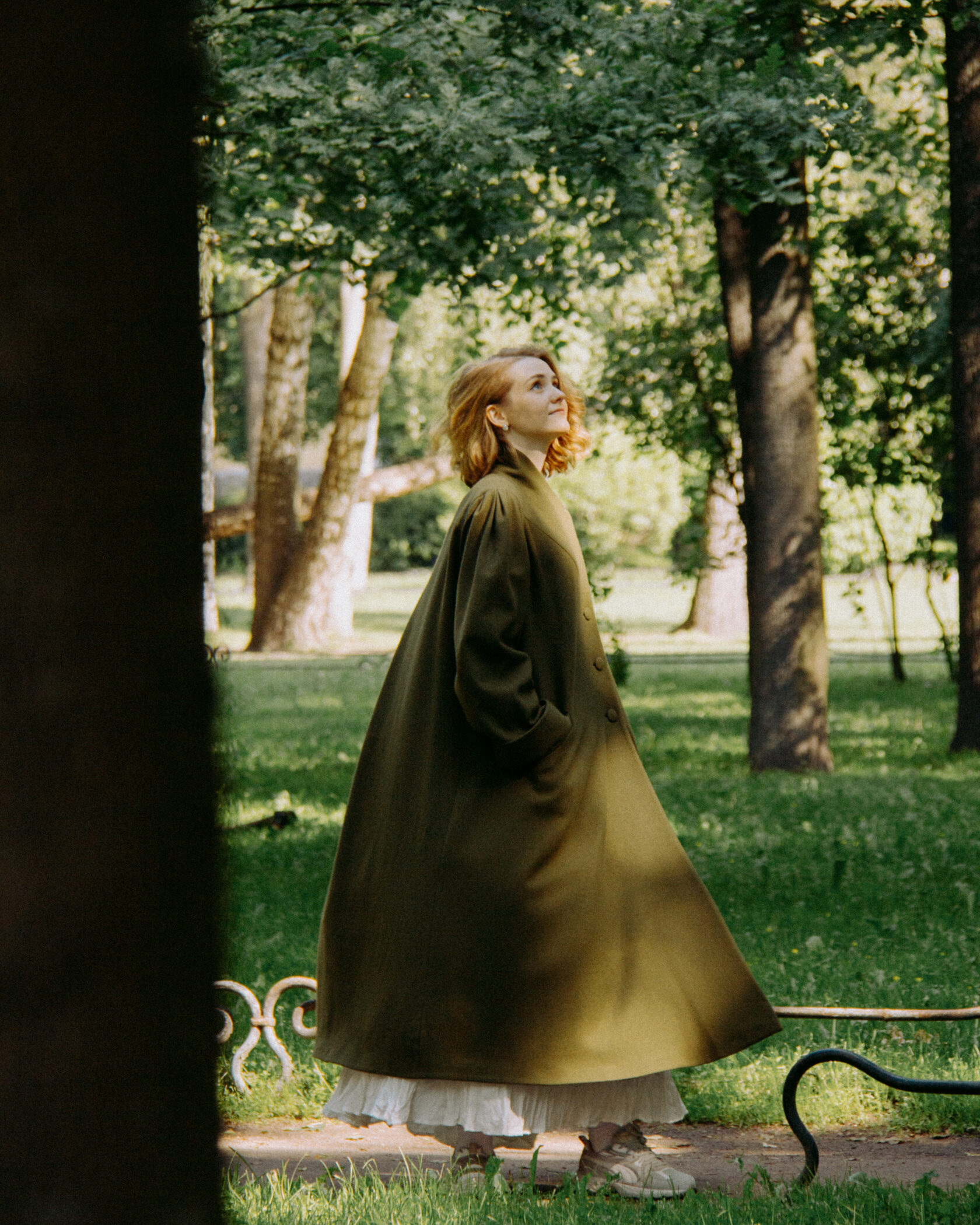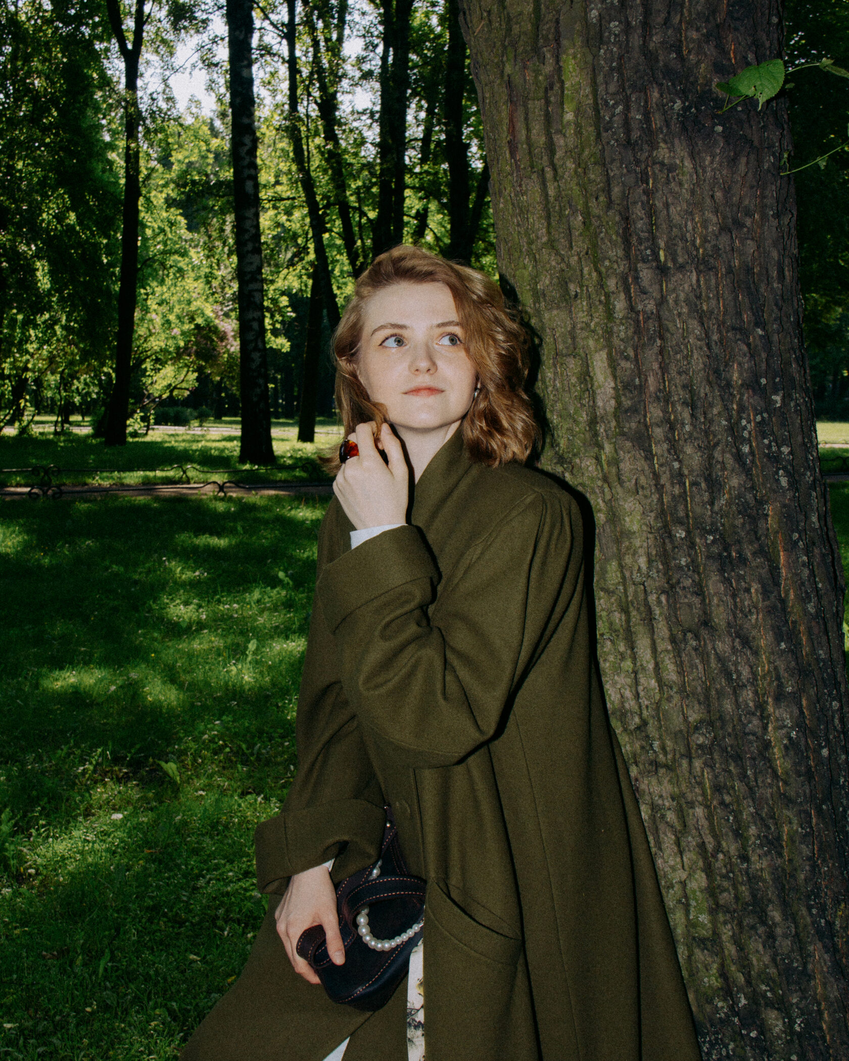 Детали Палто трапециевидного силуэта в оттенке хаки, с отрезной кокеткой по полочке и спинке, подплечники создают акцент в области плеч, на рукавах 2 встречные складки.