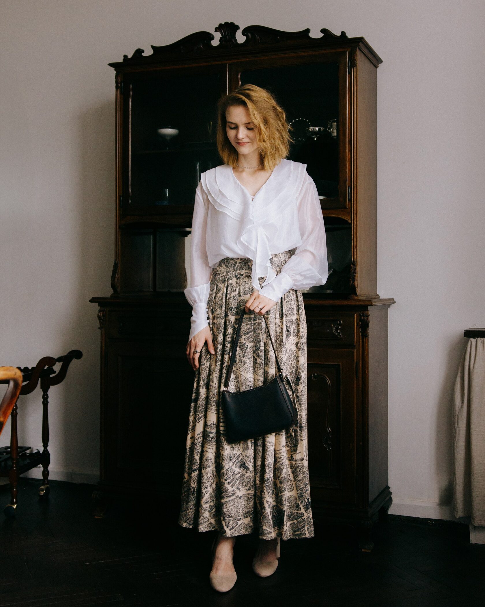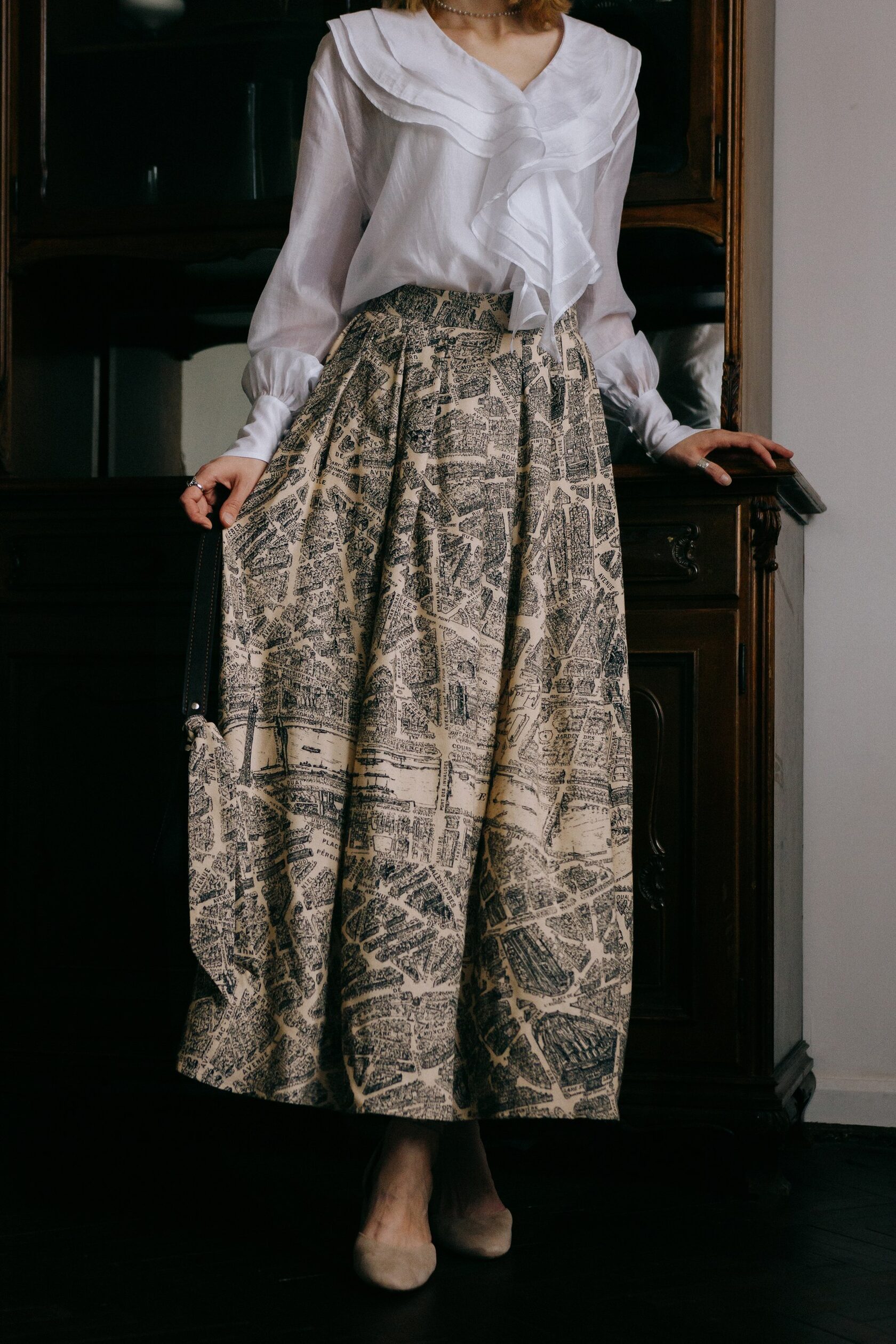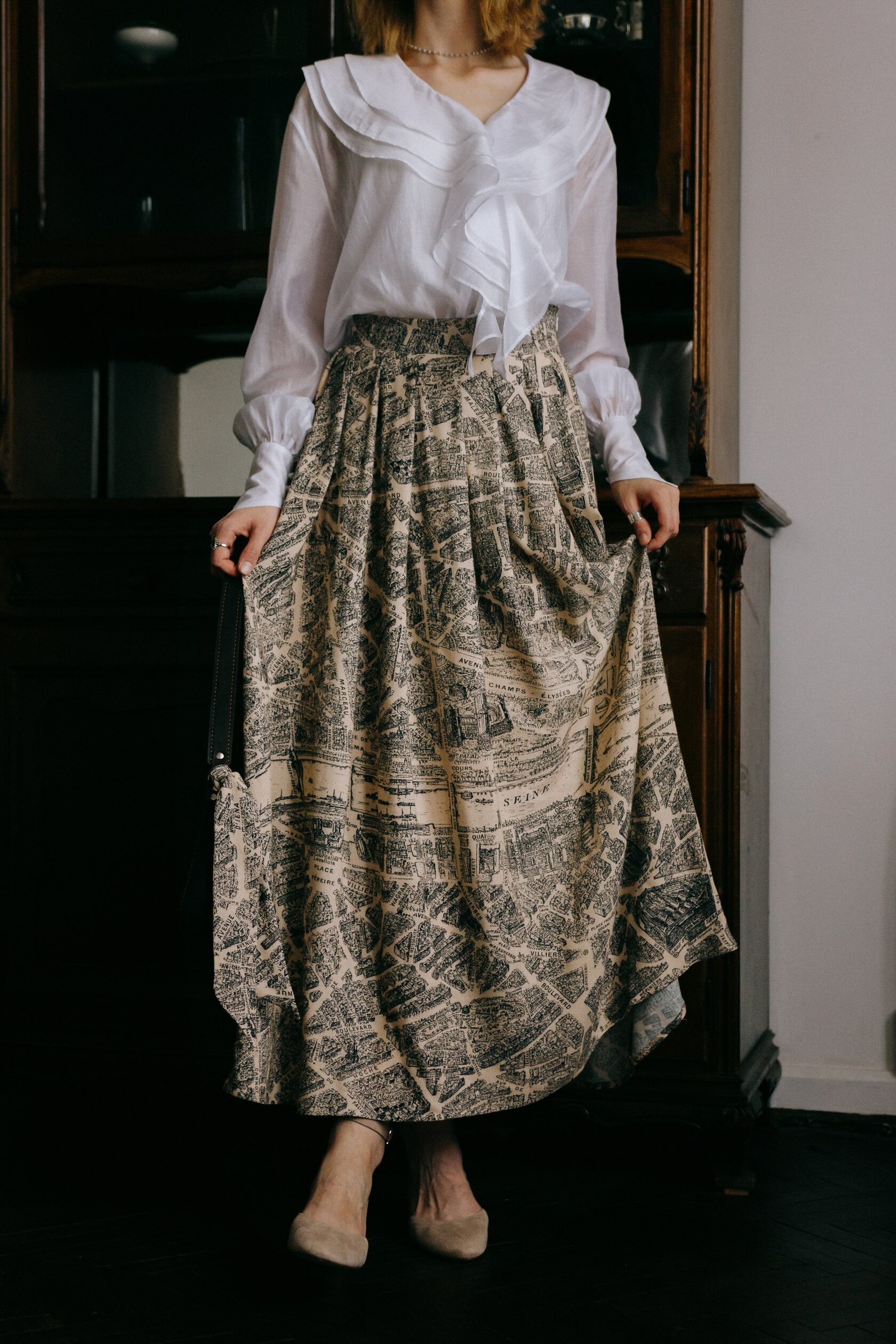 Принт на юбке Plan de Paris впервые был создан Кристианом Диором в 1950-х годах для шелкового платка. Этот знаковый принт возродил креативный директор Мария Грация Кьюри для коллекции осень-зима 2023, подчеркивая связь Dior с Парижем и предлагая «карту» для прогулки по городу.