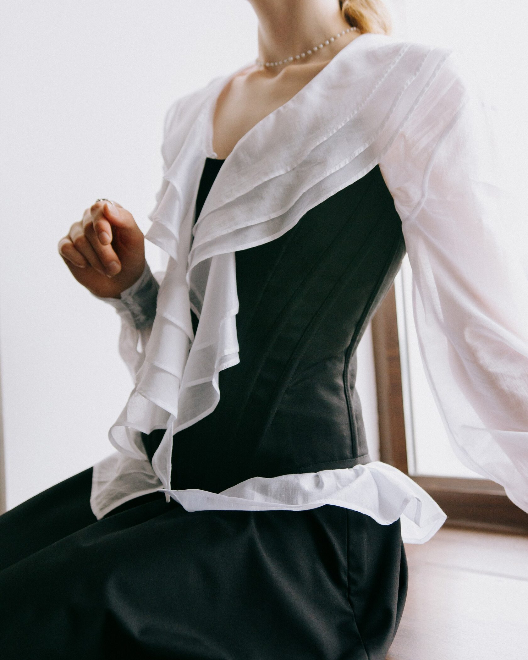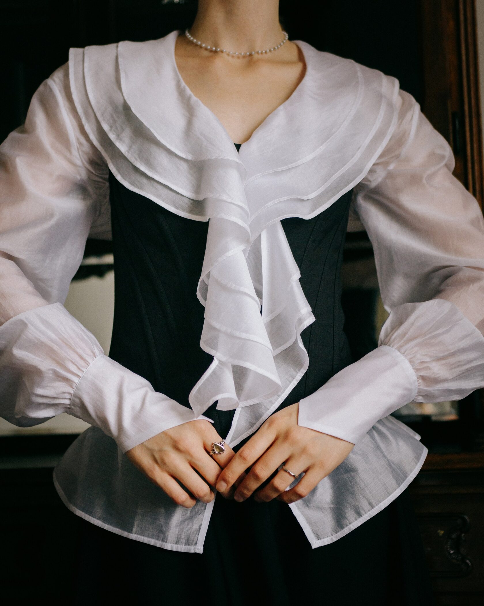 Детали Белая блуза прямого кроя oversize, с воланами и фигурными манжетами. По центру застежка на одну верхнюю пуговицу и шнуровку. Блуза прозрачная, под нее рекомендуем надевать корсаж, топ или корсет.