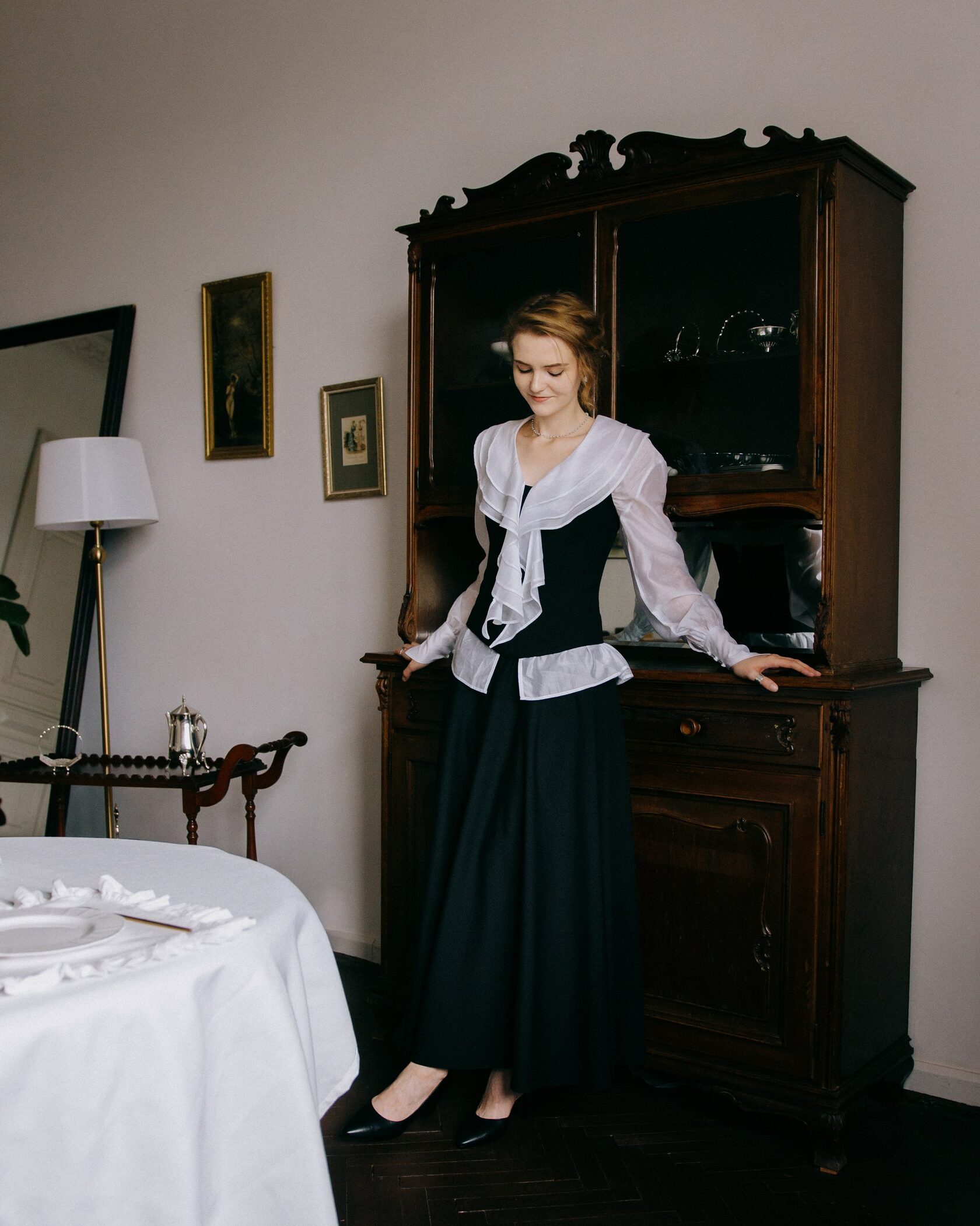 Это самая первая блуза коллекции, именно поэтому - prima. Легкость и игривость, белый оттенок, благодаря чему она освежит, как летняя роса, любой образ.